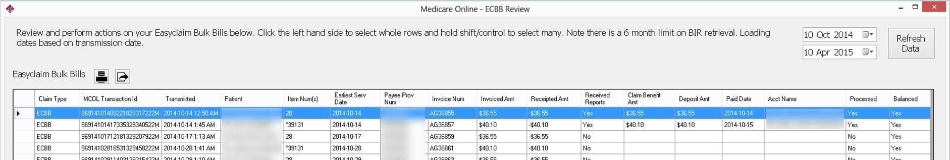 - The dates for loading data relate to the date that the Easyclaim bulk bill was transmitted (i.e. put through the EFTPOS terminal). - You can specify a greater date range than 6 months, and it will load them in this list and you can preform actions using the buttons (see below for button action descriptions), but you won't be able to get BIR reports for claims that are older so they will need manual payment/reversal etc.