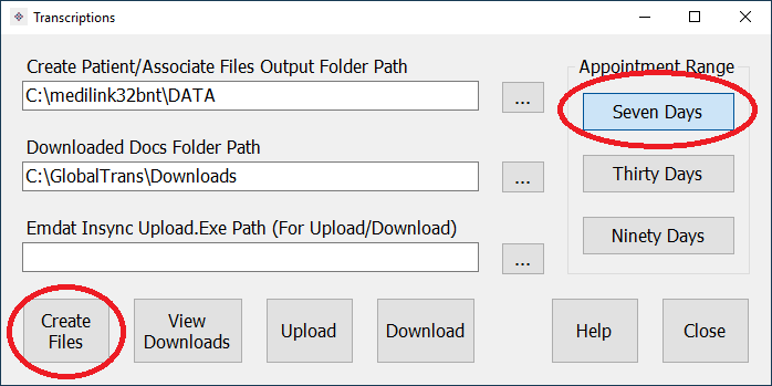 2. Choose a Range (usually 7 days) and click Create Files For Upload. This will create PATIENTS.TXT and ASSOCIATES.TXT for all patients seen in the previous X days (i.e. 7 days).