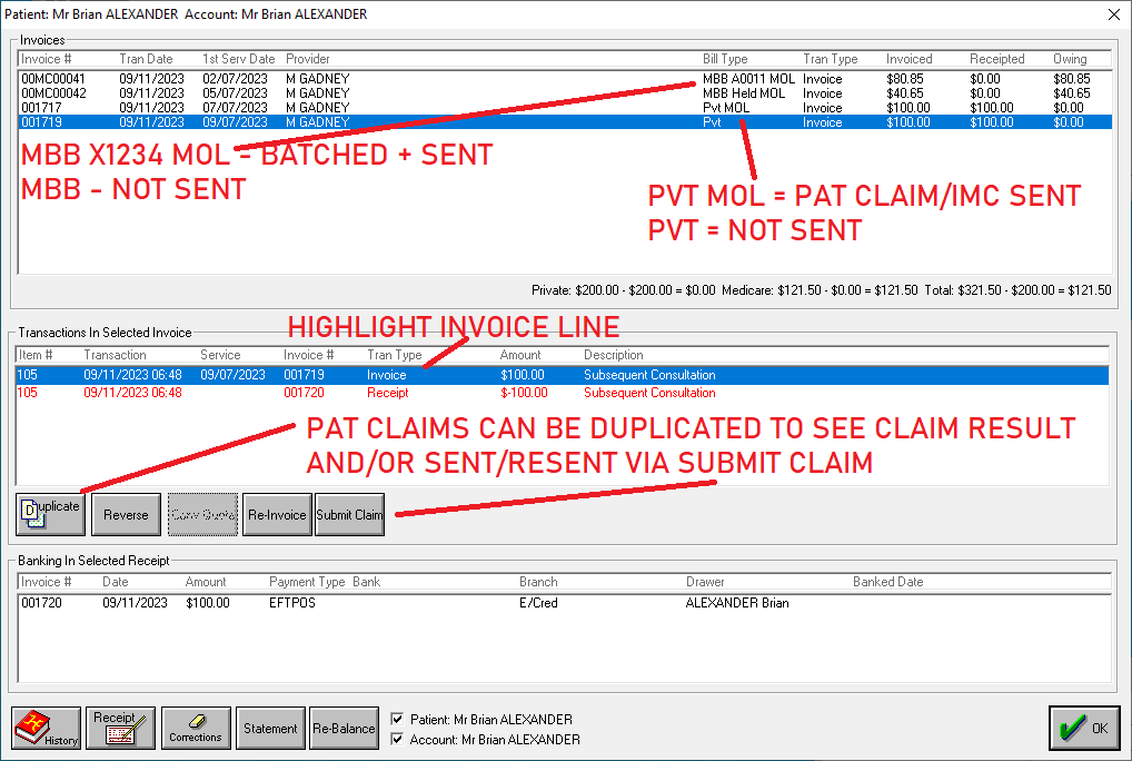 PVT MOL = Patient claim (or IMC) that has been sent. If you click Duplicate it will re-print the Statement of Claim or Lodgement Advice. If wrong reverse/correct and rebill/re-claim* it,