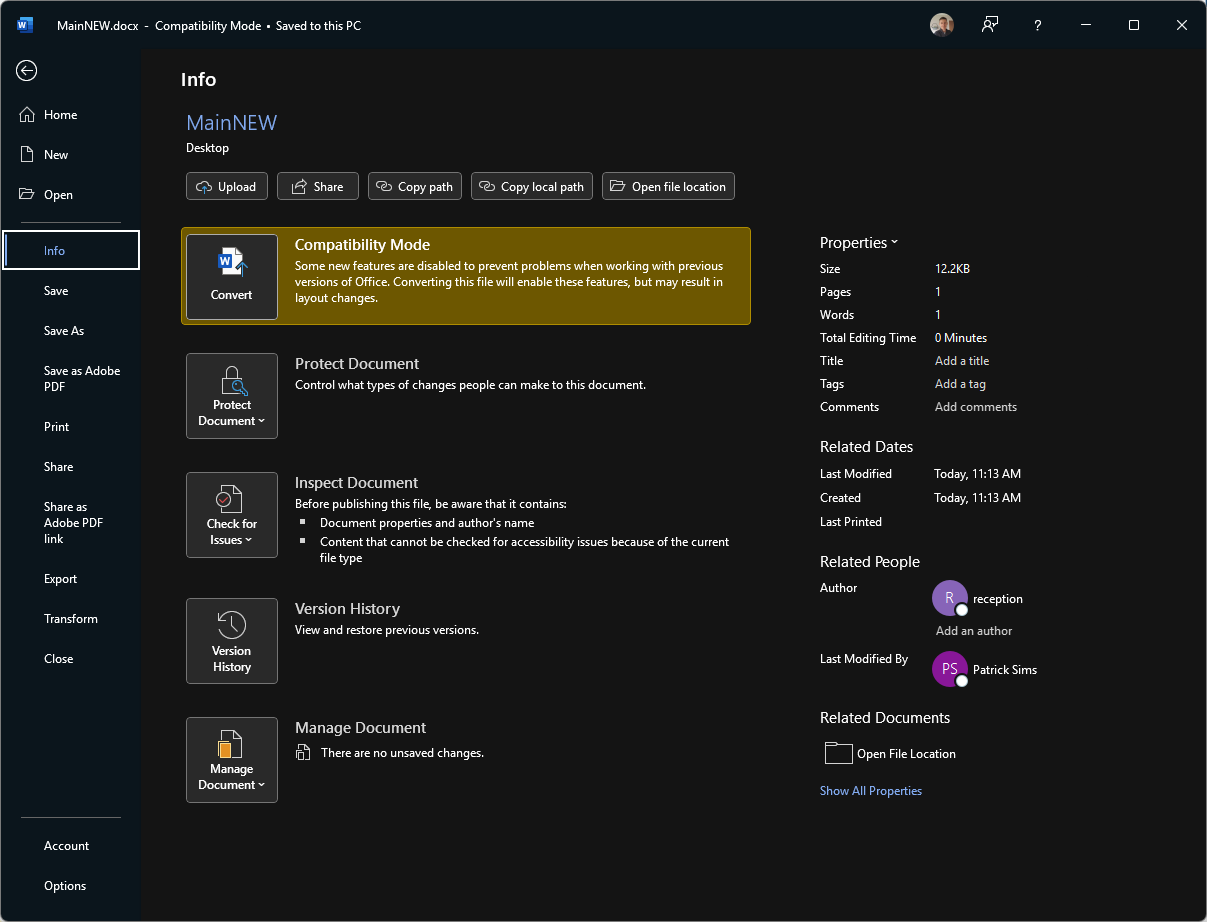 Alternatively update all of your Medilink Letter Templates (LETTERS folder, MAINA.DOCX etc) such that they no longer have Compatibility Mode enabled. You do this via File -> Info -> Compatibility Mode -> Convert (as per screenshot further below).
